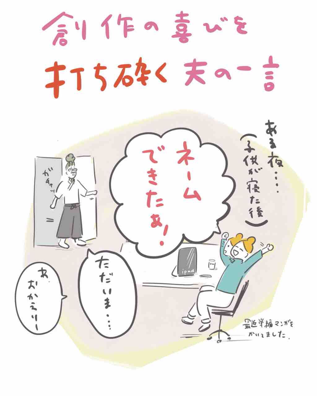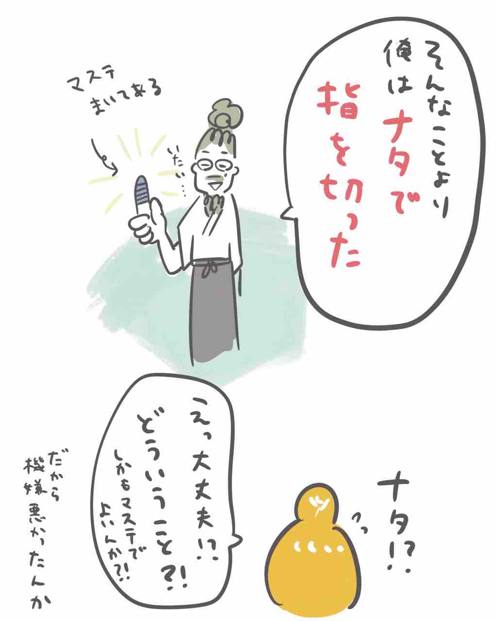 創作の喜びを打ち砕く夫の一言 2026年03月05日 20:00 こんばんは。久しぶりの更新となってしましました。この数週間は、短編エッセイ漫画を描いていたのですが思っていたよりもこだわってしまい時間がかかり…いつもの更新が全然できなかった‥そんな中での日常の出来事をこれからもちょこちょこ描いていきます。ちなみに何故かナタで指を切った夫薪割りの際に手元を滑らせたようです。マスキングテープで応急処置し、(それしかなかったんか?)一晩中痛いのを我慢し次の日は朝イチでキズパワーパッドを買いにいっていました。それではまた! 「くらし」カテゴリの最新記事 < 前の記事次の記事 > コメント コメントフォーム 名前 コメント 記事の評価 リセット リセット 顔 星 情報を記憶 コメントを投稿する