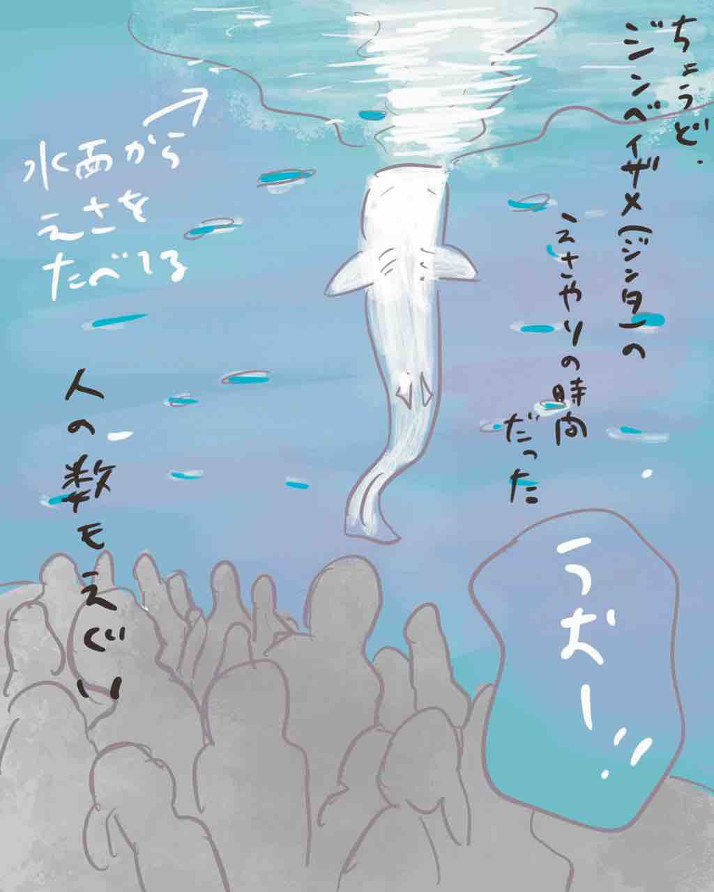 黒潮の海の水槽では、ちょうどジンベイザメのジンタの餌やりの時間で、
